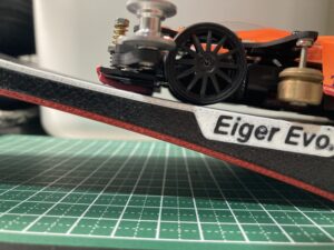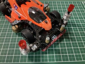 青ブレーキへの変更も考えましたが、モーターによってマシン速度も上がるので赤ブレーキのまま効きの強さを変える調整にしています。
