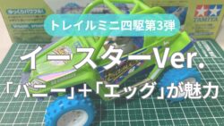 トレイルミニ四駆の第3弾として登場したのが「イースターバージョン」。イースターらしいカラフルなマシンデザインはもちろん、「バニー」と「エッグ」のドライバー人形もポイント。さらに他のミニ四駆には無い、ライトブルーのスパイクタイヤも付属しています。